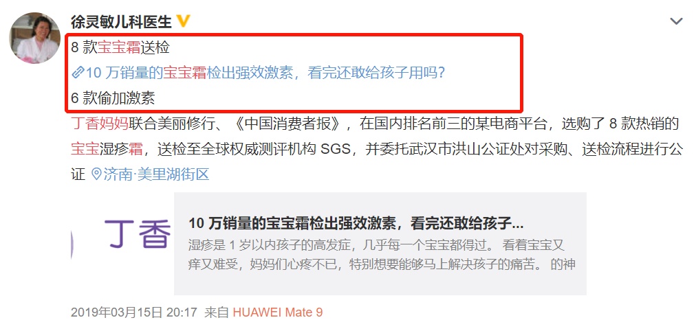 去年 3·15 ,“丁香妈妈”发文揭露过宝宝湿疹霜含激素的问题,送检的 8 款热销的宝宝湿疹霜中,6款都偷偷加了激素!